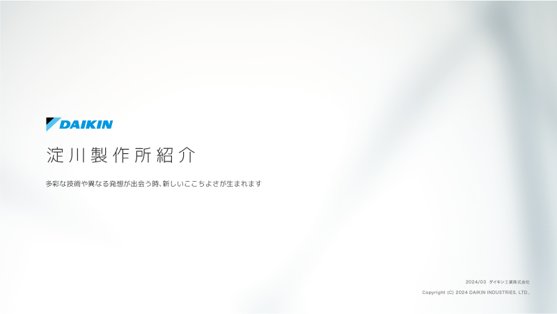 異なる4つの事業部門と、テクノロジー・イノベーションセンター(TIC)を有する淀川製作所では、各事業部門間の人の交流を積極的に進めています。そこから生まれる多彩な発想を日々の活動に反映し、新しい価値をもつ製品の創造に取り組んでいます。つねに周辺地域とのふれあいを大切にし、ともに発展・成長することを目指して地域社会との交流・対話を推進しています。誰もがいきいきと活動できる活気に満ちた工場づくりを行っています。