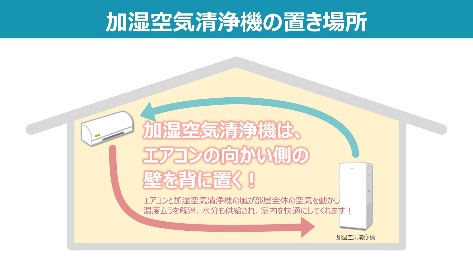 こうした場面で役立つのが「加湿空気清浄機」です。加湿空気清浄機の効果的な置き場所は、エアコンの正面の壁付近です。加湿空気清浄機から吹き出す潤った風によって室内の空気を動かすことができ、温度ムラを解消しながら湿度を上げることができます。ただし、外気によって冷やされた窓際などは結露が起こりやすく、設置場所として適していないため注意しましょう。