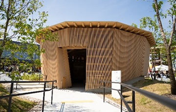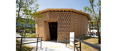 大阪・関西万博の暑さ対策として設置した、自然エネルギーを利用した休憩所です。氷や雪を貯蔵する伝統的な氷室から着想を得ており、氷蓄熱空調※2の技術を活用して自然で涼しい環境を提供します。太陽光パネルで発電した電力を一部利用して生成した氷による冷輻射※3によって、氷室にいるような心地よい涼しさを届けます。内壁と外壁には日本古来の木組み格子を使用し、外気の侵入を防ぎながらも陽の光が入る開放的な構造を取り入れています。格子による木造建築と緑色の太陽光パネルの採用することで、周囲に溶け込む外観デザインを実現しています。
