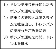 冷房運転中のエアコンは、製品内部の熱交換器が結露します。結露によって発生した水滴は室内機の中にあるドレンパンに集められ、ポンプを使用して屋外へ排水します※8。しかし、高温多湿の環境ではドレンパンにたまった汚れがスライム状になりやすく、排水ポンプが詰まることがあります。排水不良が起きると、エアコンは異常を検知し運転を停止します。その場合は適切な清掃をしないと運転を再開できず、店舗の営業に支障をきたすなどの困りごととなっていました。
