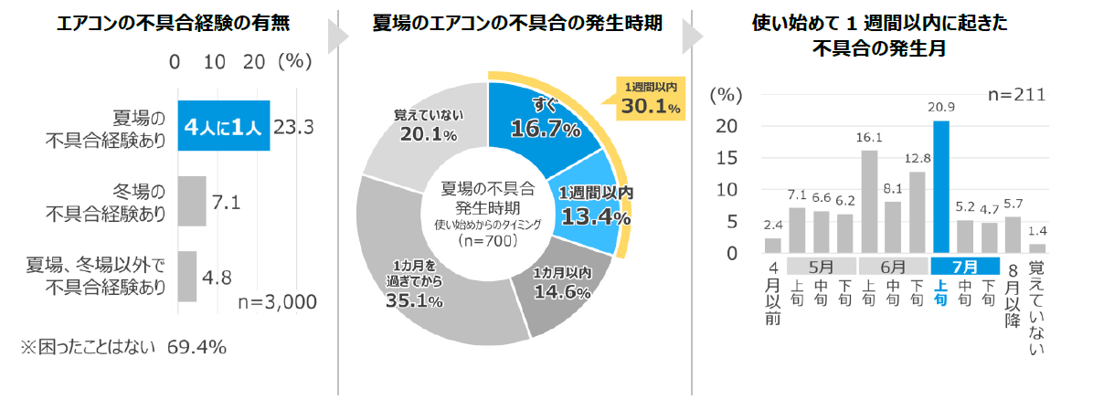 エアコンの不具合の経験について聞いたところ、、夏場にエアコンの不具合を経験した人は約4人に1人(23.3%)で、不具合が発生したタイミングは使い始めてから「1週間以内」が約3割(30.1%)を占め、1週間以内の発生月としては「7月上旬」が最も多い結果となりました。暖房シーズン後、使用していないエアコンを気温の高い時期にいきなり使い始めることで本体に負荷がかかりやすくなり、不具合が生じやすくなる可能性もあります。