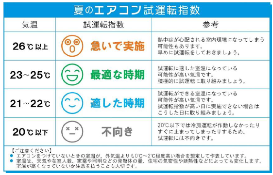 試運転をすることで夏場の不具合のすべてが回避できるわけではありませんが、試運転によって発見できる不具合や故障もあります。夏本番に慌てないためにも早めの試運転で、今年の夏を快適に、安心して過ごせるよう、本資料をご活用ください。