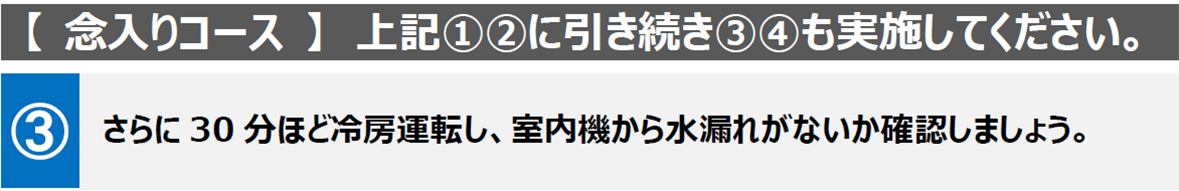 実施方法によっては、不具合に気づかないまま使用時期を迎えてしまう可能性があります。試運転の際は、使用しているエアコンのメーカーを確認の上、各社のWEBサイトなどで推奨されている手順で行うことをおすすめします。