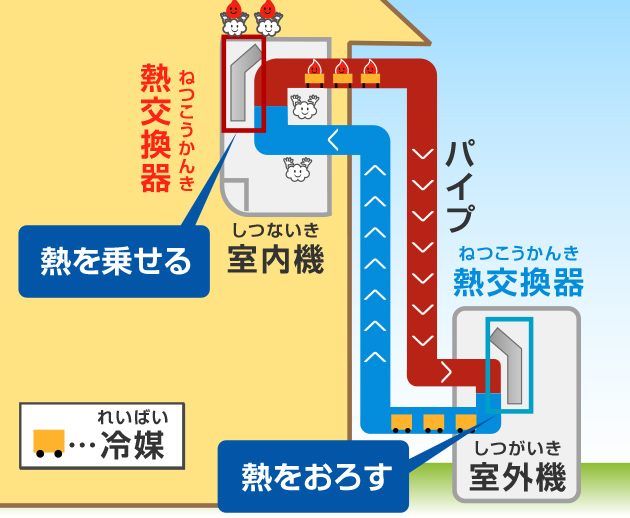 空気の中には、「熱」がふくまれているんだ。空気の中にふくまれる「熱」が多いと部屋はあつくなる。ぎゃくに、空気の中の「熱」が少ないと部屋はすずしくなるんだ。