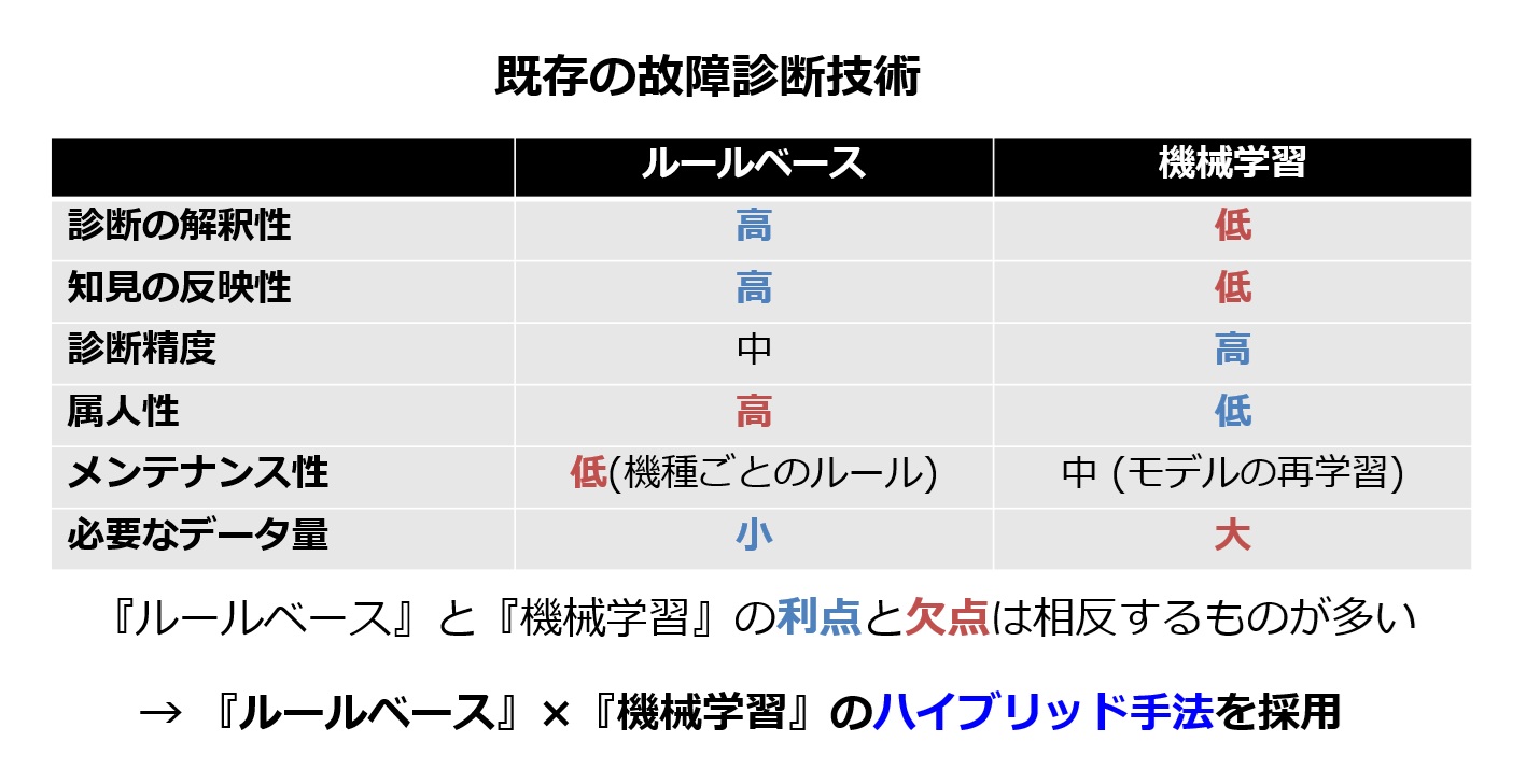 そのため、ルールベースの故障診断はごく一部の範囲にしか適用ができなかったり、広い範囲に適用しようとすると運用コストが嵩むという問題がありました。ちなみにルールベースで故障診断をするには、機種ごとに異なるルールが必要です。
