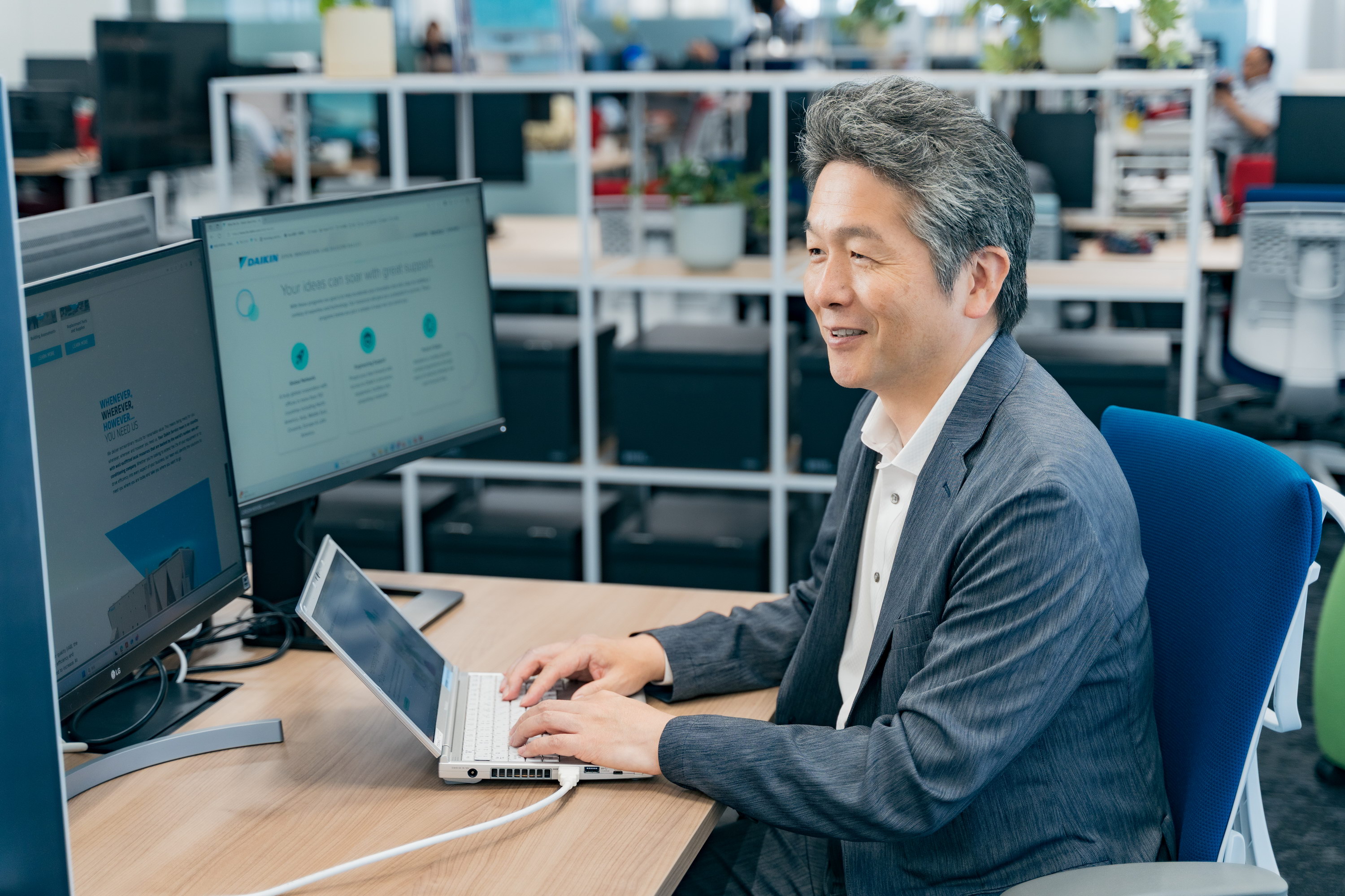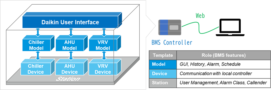 坪内:ダイキンはこれまで空調機器を作って成長してきた会社です。しかし、ただ空調機器(モノ)を作って売るだけでは、お客様に提供できる価値が限定的な範囲に留まってしまいます。そこで、考えたのがBMS※1領域への事業拡大です。当社の空調機器を導入してくださったお客様のビル設備をワンストップで管理できるBMSを開発することで、より大きな価値を持つソリューション(コト)をお客様に提供できると考えました。